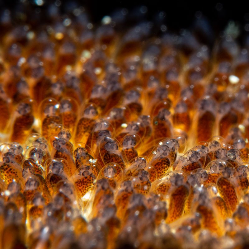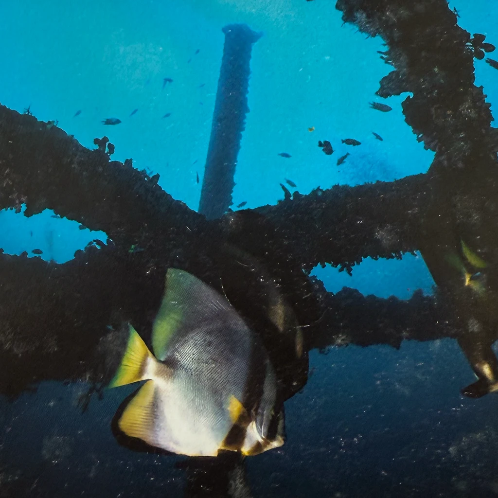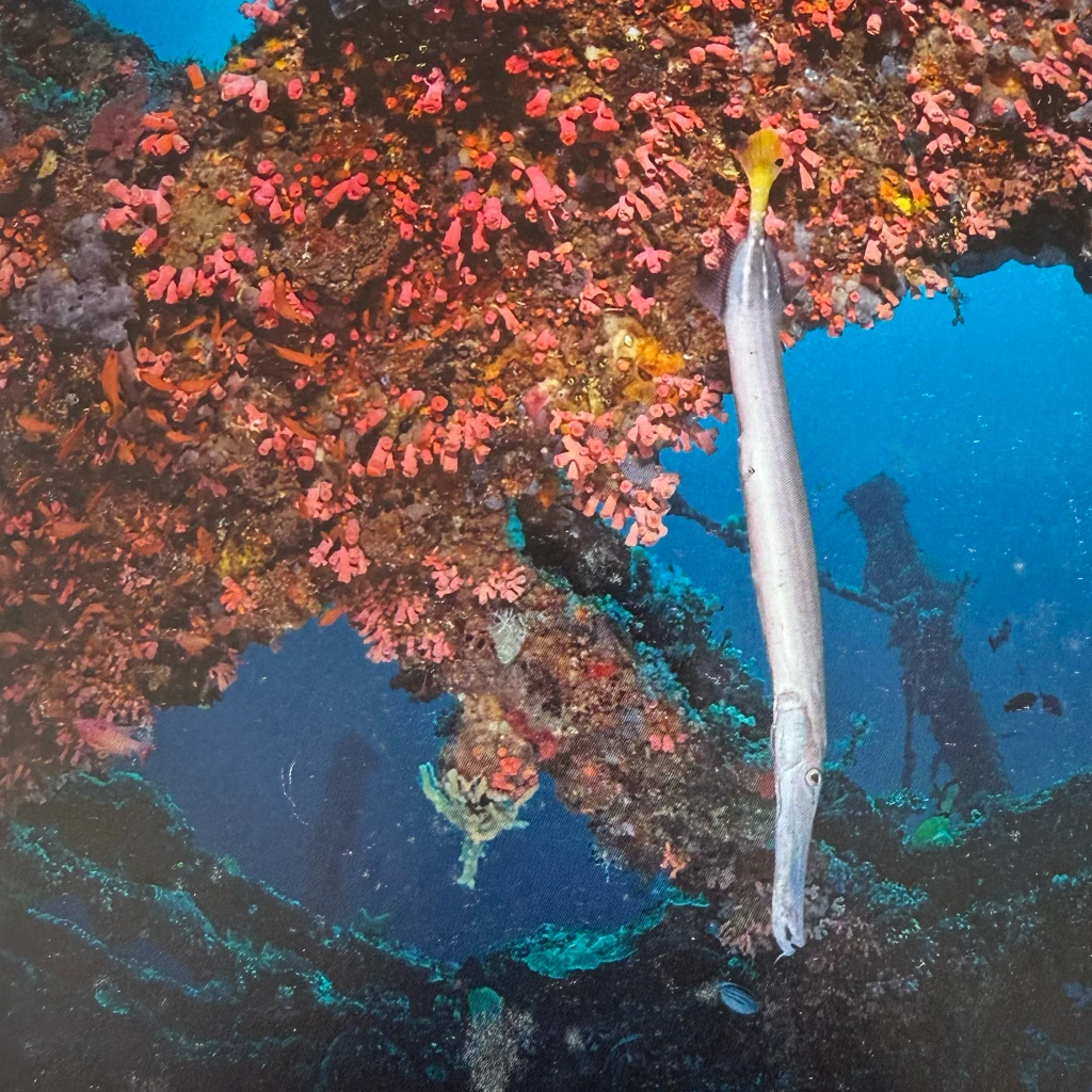 Swim through the open skeleton of the barge, school of batfish, trumpetfish, frogfish, mandarin fish, hatching jawfish.